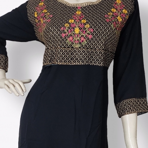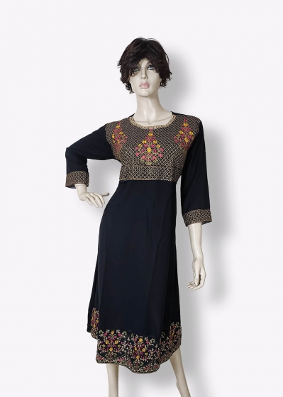 প্রবাসে যেসব আপুরা আমদের দেশি বুটিক হাউজের কটনের ড্রেস গুলো প্রচণ্ড ভাবে মিস করছেন তাদের জন্য Pundro.Com এর এবারের আয়োজন নান্দনিক ডিজাইনের রুচিশীল চমৎকার সব বুটিকস ওয়ান পিস। কালো রঙয়ের ওয়ান পিসটিতে সফট জর্জেট ফেব্রিকের উপর বুকে ও দামানে চমৎকার মাল্টি কালার এমব্রয়ডারির ডিজাইন রয়েছে। ড্রেসটি ক্যাজুয়াল এবং একইসাথে পার্টি ড্রেস হিসেবেও মানানসই।