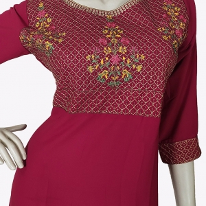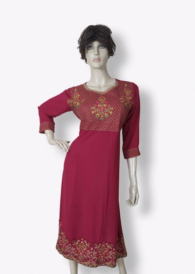 প্রবাসে যেসব আপুরা আমদের দেশি বুটিক হাউজের কটনের ড্রেস গুলো প্রচণ্ড ভাবে মিস করছেন তাদের জন্য Pundro.Com এর এবারের আয়োজন নান্দনিক ডিজাইনের রুচিশীল চমৎকার সব বুটিকস ওয়ান পিস। মেরুন রঙয়ের ওয়ান পিসটিতে সফট জর্জেট ফেব্রিকের উপর বুকে ও দামানে চমৎকার মাল্টি কালার এমব্রয়ডারির ডিজাইন রয়েছে। ড্রেসটি ক্যাজুয়াল এবং একইসাথে পার্টি ড্রেস হিসেবেও মানানসই।