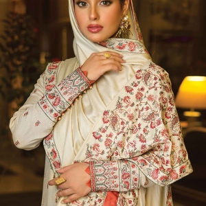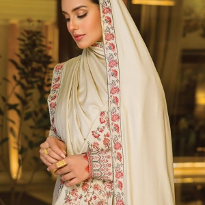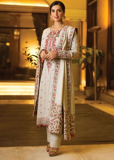 MAESTRO is off white color Pakisthani Dobby Linen stitch winter three piece. Presents with heavy multi color embroidery and lace work on full body of kameez, same color shalwar and wool fabric heavy embroidery shawl .