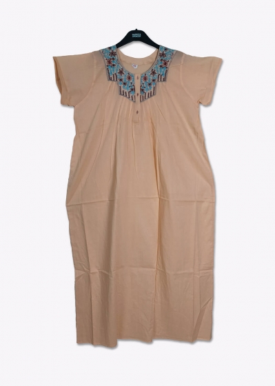 মাক্সি নারীদের ঘরোয়া আরমাদায়ক পোশাকের মধ্যে অন্যতম। প্রবাসে বাঙালি নারীদের জন্য আমাদের দেশিও স্টাইলের মাক্সি সহজলভ্য নয়। তাই Pundro.com এবার নিয়ে এলো আপনাদের জন্য খুবই আরামদায়ক সুতির দেশিও ঢঙে চমৎকার রঙবেরঙের সব মাক্সি। বেইজ কালার সর্ট স্লিভ মাক্সিটির ফ্রন্টে চমৎকার এমব্রয়ডারি কাজ রয়েছে।