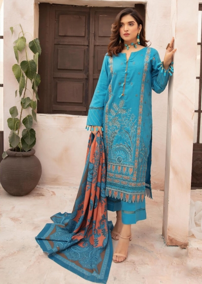NUREH by RangRaiz: luxury winter collection; Digital premium soft italian wool shawl; Dyed cyan fully heavy embroidery shirt; Dyed italian cyan trouser; 10 design 10 outfits in box. Each suit is inside a beautiful luxury gift box;