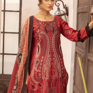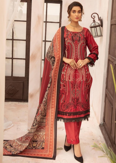 NUREH by RangRaiz: luxury winter collection; Digital premium soft italian wool shawl; Dyed maroon fully heavy embroidery shirt; Dyed italian maroon trouser; 10 design 10 outfits in box. Each suit is inside a beautiful luxury gift box;
