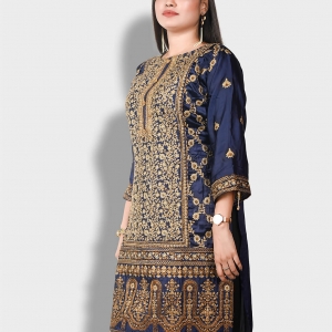কুর্তি কিংবা ওয়ান পিস ইয়ং জেনারেশন মেয়েদের পছন্দের শীর্ষে ফ্যাশনেবল একটি পোশাক। Pundro.Com প্রবাসী নারীদের জন্য নিয়ে এলো পাকিস্থানের বিখ্যাত বিন সাইয়িদের সুনিপুণ জ্বরি ও মিনাকারি কারুকাজের সমন্বয়ে গর্জিয়াস লুকের সব কুর্তি। এই কুর্তিটি রয়্যাল ব্লু কালারের সিল্ক ফেব্রিকের উপর ফ্রন্ট পার্টে সম্পূর্ণ সিলভার জ্বরি সুতার এমব্রয়ডারি রান্নিং কাজ করা আছে।হাতায় এবং দামানে থাকছে চমৎকার কারদানা টার্সেল। যেকোন পার্টিতে হালকা মেকআপ ও জুয়েলারীতেও গর্জিয়াস লুকের জন্য এই কুর্তিটি সংগ্রহে রাখার মত।