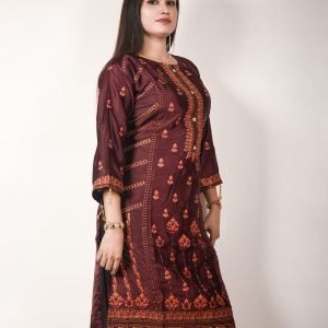 কুর্তি কিংবা ওয়ান পিস এই জেনারেশনের মেয়েদের পছন্দের শীর্ষে থাকা ফ্যাশনেবল একটি পোশাক। Pundro.Com প্রবাসী নারীদের জন্য নিয়ে এলো পাকিস্তানের বিখ্যাত বিন সাইয়িদের সুনিপুণ জরি ও মিনাকারি কারুকাজের সমন্বয়ে গর্জিয়াস লুকের সব কুর্তি। এই কুর্তিটি ডিপ মেরুন কালারের সিল্ক ফেব্রিকের উপর ফ্রন্ট পার্টে গোল্ডেন জরি সুতার এমব্রয়ডারি কাজ করা আছে। হাতায় এবং দামানে থাকছে চমৎকার কারদানা টার্সেল। যেকোন পার্টিতে হালকা মেকআপ ও জুয়েলারীতেও গর্জিয়াস লুকের জন্য এই কুর্তিটি সংগ্রহে রাখার মত।