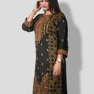 কুর্তি কিংবা ওয়ান পিস এই জেনারেশনের মেয়েদের পছন্দের শীর্ষে থাকা ফ্যাশনেবল একটি পোশাক। Pundro.Com প্রবাসী নারীদের জন্য নিয়ে এলো পাকিস্তানের বিখ্যাত বিন সাইয়িদের সুনিপুণ জরি ও মিনাকারি কারুকাজের সমন্বয়ে গর্জিয়াস লুকের সব কুর্তি। এই কুর্তিটি ব্ল্যাক কালারের সিল্ক ফেব্রিকের উপর ফ্রন্ট পার্টে গোল্ডেন জরি সুতার এমব্রয়ডারি কাজ করা আছে। হাতায় এবং দামানে থাকছে চমৎকার কারদানা টার্সেল। যেকোন পার্টিতে হালকা মেকআপ ও জুয়েলারীতেও গর্জিয়াস লুকের জন্য এই কুর্তিটি সংগ্রহে রাখার মত।