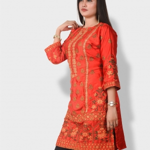 কুর্তি কিংবা ওয়ান পিস এই জেনারেশনের মেয়েদের পছন্দের শীর্ষে থাকা ফ্যাশনেবল একটি পোশাক। Pundro.Com প্রবাসী নারীদের জন্য নিয়ে এলো পাকিস্তানের বিখ্যাত বিন সাইয়িদের সুনিপুণ জরি ও মিনাকারি কারুকাজের সমন্বয়ে গর্জিয়াস লুকের সব কুর্তি। এই কুর্তিটি ডিপ অরেঞ্জ কালারের সিল্ক ফেব্রিকের উপর ফ্রন্ট পার্টে সম্পূর্ণ গোল্ডেন জরি সুতার এমব্রয়ডারি সাথে লাল-সবুজের মিনাকারি কাজ করা আছে।হাতায় এবং দামানে থাকছে চমৎকার কারদানা টার্সেল। যেকোন পার্টিতে হালকা মেকআপ ও জুয়েলারীতেও গর্জিয়াস লুকের জন্য এই কুর্তিটি সংগ্রহে রাখার মত।