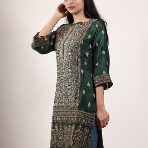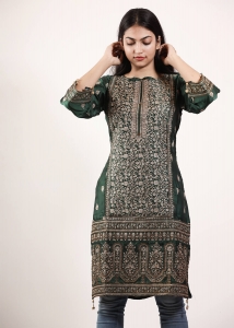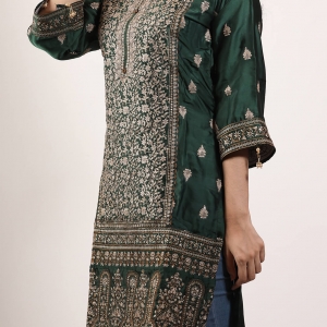 কুর্তি কিংবা ওয়ান পিস এই জেনারেশনের মেয়েদের পছন্দের শীর্ষে থাকা ফ্যাশনেবল একটি পোশাক। Pundro.Com প্রবাসী নারীদের জন্য নিয়ে এলো পাকিস্তানের বিখ্যাত বিন সাইয়িদের সুনিপুণ জরি ও মিনাকারি কারুকাজের সমন্বয়ে গর্জিয়াস লুকের সব কুর্তি। এই কুর্তিটি গ্রিন কালারের সিল্ক ফেব্রিকের উপর ফ্রন্ট পার্টে সম্পূর্ণ সিলভার জরি সুতার এমব্রয়ডারি রানিং কাজ করা আছে।হাতায় এবং দামানে থাকছে চমৎকার কারদানা টার্সেল। যেকোন পার্টিতে হালকা মেকআপ ও জুয়েলারীতেও গর্জিয়াস লুকের জন্য এই কুর্তিটি সংগ্রহে রাখার মত।