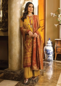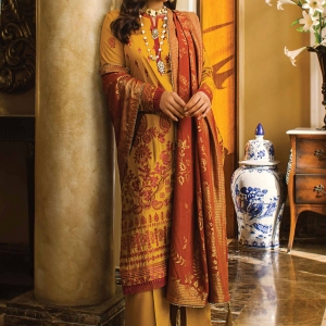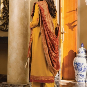 REGAL is yellow color Pakisthani Dobby Linen stitch winter three piece. Presents with heavy red fox color embroidery and lace work on full body of kameez, same color shalwar and wool fabric heavy embroidery shawl .