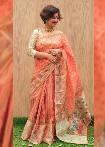 কালের বিবর্তনে বদলেছে শাড়ির পাড়-আঁচল, বুনন এবং পরিধানশৈলী কিন্তু এখনো বাঙ্গালী নারীর হৃদয়ে শাড়ির স্থান দখল করতে পারেনি অন্য কোন পোশাক।উৎসবে আনন্দে, দেশে কিংবা প্রবাসে বাঙ্গালী নারীর প্রিয় পরিচ্ছদ শাড়ি। Pundro এর শাড়ি কালেকশনে আছে ব্লক প্রিন্টের স্যামন কালারের শাড়ি।সোনালী আঁচলে রয়েছে ডলারের কাজ এবং টার্সেল। যেকোন পার্টিতে হালকা মেকআপ ও জুয়েলারীতেও গর্জিয়াস লুকের জন্য এই শাড়িটি সংগ্রহে রাখার মত।