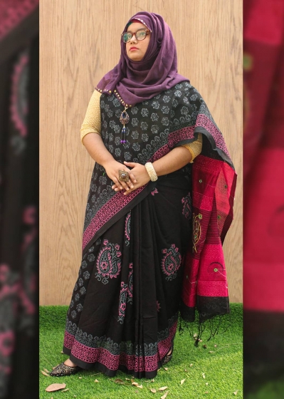কালের বিবর্তনে বদলেছে শাড়ির পাড়-আঁচল, বুনন এবং পরিধানশৈলী কিন্তু এখনো বাঙ্গালী নারীর হৃদয়ে শাড়ির স্থান দখল করতে পারেনি অন্য কোন পোশাক।উৎসবে আনন্দে, দেশে কিংবা প্রবাসে বাঙ্গালী নারীর প্রিয় পরিচ্ছদ শাড়ি। Pundro এর শাড়ি কালেকশনে আছে ব্লক প্রিন্টের কালো রঙের শাড়ি। ম্যাজেন্টা আঁচলে রয়েছে ডলারের কাজ এবং কালো টার্সেল। যেকোন পার্টিতে হালকা মেকআপ ও জুয়েলারীতেও গর্জিয়াস লুকের জন্য এই শাড়িটি সংগ্রহে রাখার মত।