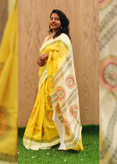 - রং : হলুদ জমিনে ব্লক প্রিন্ট এবং অফ ওয়াইট রঙের আঁচলে মাল্টি কালারের ব্লক এমব্রয়ডারি কাজ