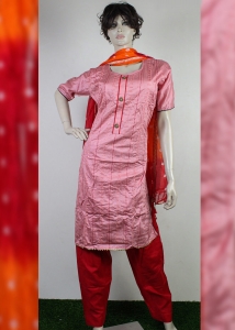 Pink color cotton Indian stitch three piece. Presents with embroidery work on full body of kameez, orange color shalwar and half silk dupatta