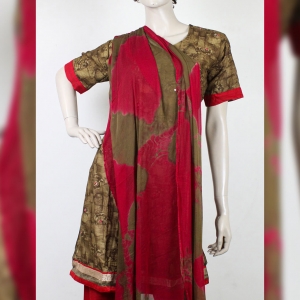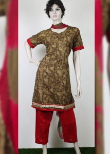Deep beige color cotton Indian stitch three piece. Presents with multi color printed dollar work on full body of kameez, red color shalwar and chiffon dupatta