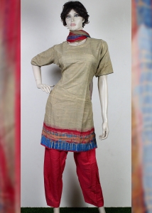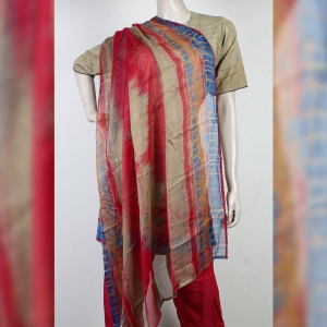 Beige color lawn Indian stitch three piece. Presents with multi printed work on full body of kameez, red color shalwar and chiffon dupatta
