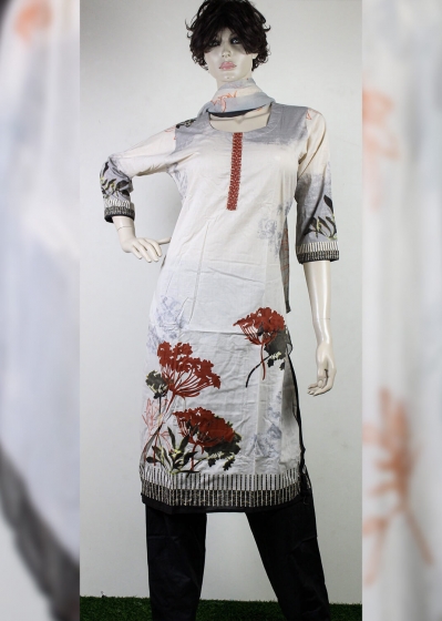 Off white color cotton Indian stitch three piece. Presents with multi color printed and embroidery work on full body of kameez, gray color shalwar and chiffon dupatta