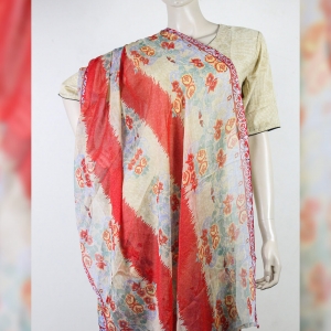 Beige color Lawn Indian stitch three piece. Presents with multi color printed work on full body of kameez, orange color salwar and chiffon dupatta