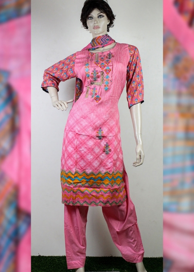 Pink color cotton Indian stitch three piece. Presents with multi color printed and embroidery work on full body of kameez, pink color shalwar and chiffon dupatta