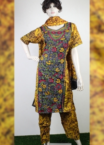 Shanti Niketon’s hand work yellow batik printed cotton stitch three piece. Presents with embroidery work on front part of kameez, yellow color shalwar and soft cotton dupatta.