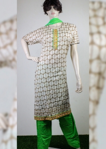 Biscuit color cotton stitch Indian three piece. Presents with embroidery and printed work on full body of kameez, paddy green color shalwar and chiffon dupatta