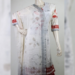 Off white color cotton Indian stitch three piece. Presents with red color printed on full body of kameez, red color shalwar and chiffon dupatta