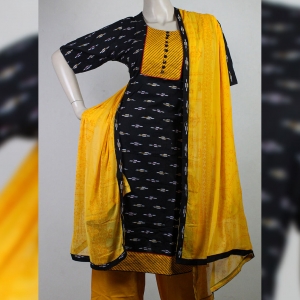 Black color cotton Indian stitch three piece. Presents with embroidery work and white batik color printed on full body of kameez, yellow color shalwar and chiffon dupatta