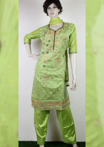 Pistachio color dhupiyan silk Indian stitch three piece. Presents with printed and heavy golden embroidery stone work on full body of kameez, green color shalwar and georgette dupatta