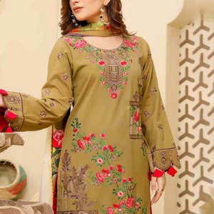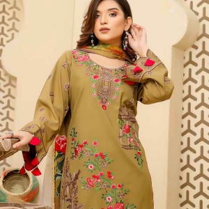 WARESHA: Luxury warm olive sweet leather ; Fully multihead embroiderd shirt; Emb back n sleevs; Plain trouser; Printed wool shawl;