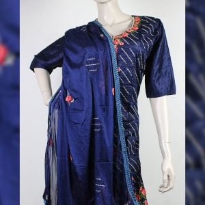 Deep blue color cotton Indian stitch three piece. Presents with heavy multi color embroidery work on full body of kameez, deep blue color shalwar and georgette dupatta