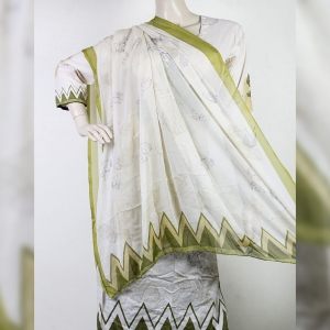 Off white color cotton Indian stitch three piece. Presents with olive color printed and embroidery work on full body of kameez , olive color shalwar and chiffon dupatta