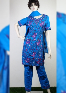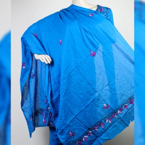Shanti Niketon’s hand work blue color cotton stitch three piece. Presents with multicolor hand work on front part of kameez, lower part of shalwar and two borders of dupatta.