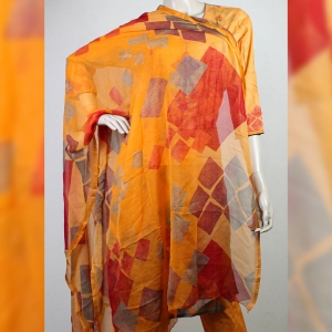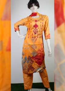 Royal orange color cotton stitch Indian three piece. Presents with embroidery work on front part of kameez, royal orange color shalwar and chiffon dupatta