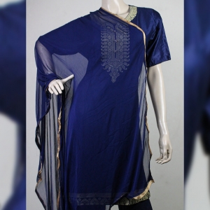 Navy blue color cotton Indian stitch three piece. Presents with embroidery work on full body of kameez, navy blue color shalwar and chiffon dupatta