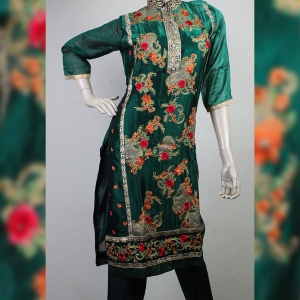 Jungle green color georgette Indian stitch three piece. Presents with heavy embroidery work on full body of kameez, jungle green color shalwar and chiffon dupatta