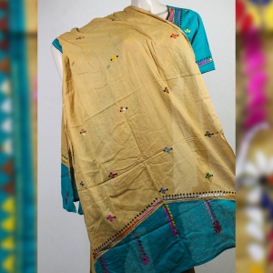 Shanti Niketon’s multi hand work on blue color cotton Indian stitch three piece. Presents with hand work on full body of kameez, beige color shalwar and cotton dupatta