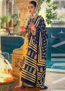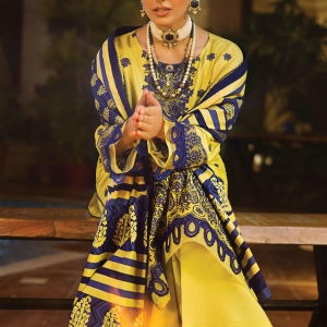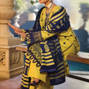 THORON is yellow color Pakisthani Dobby Linen stitch winter three piece. Presents with heavy navy blue color embroidery and lace work on full body of kameez, same color shalwar and wool fabric heavy embroidery shawl .